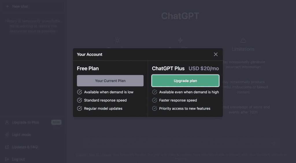 La versione a pagamento (ChatGPT “Plus”) prevede un costo mensile di $20,00 e consente di effettuare richieste al chatbot anche quando i server sono sotto carico massimo, di fruire di una velocità di risposta maggiore ed infine di accedere agli ultimi aggiornamenti disponibili del chatbot, incluso GPT-4.