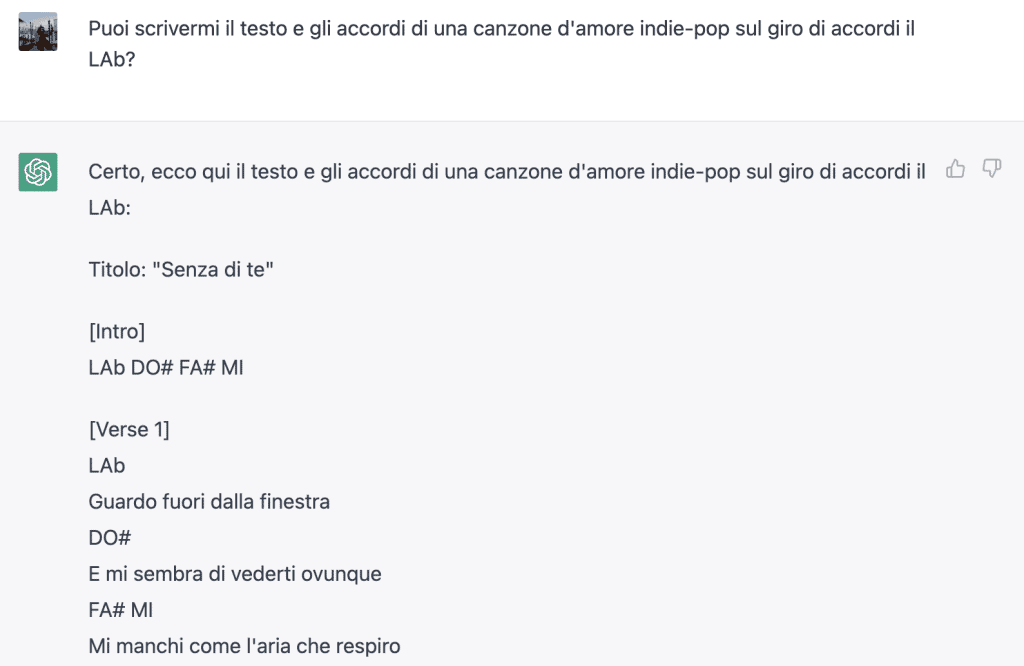 A seconda di quanto sia stata dettagliata e contestualizzata la risposta di ChatGPT fornisci il tuo feedback in merito descrivendo cosa è andato bene e cosa no ed utilizzando i pollici rossi o verdi a seconda del caso. In questo modo aiuterai ChatGPT ad affinare le sue risposte successive.
